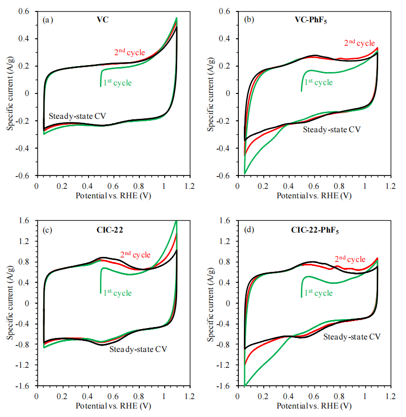圖6.8. VC、VC-PhF5、CIC-22及CIC-22-PhF5材料在氮?dú)怙柡偷?.5 M H?SO?溶液中(掃描速率10 mV/s)的循環(huán)伏安曲線(CVs)