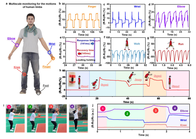 圖5.基于水凝膠的應(yīng)變傳感器在不同關(guān)節(jié)上的傳感行為。(a) PAM-Q2.0-M2.0水凝膠作為用于人體關(guān)節(jié)或運(yùn)動(dòng)檢測(cè)的柔性傳感器的示意圖。電阻相對(duì)變化對(duì)(b) 不同角度的手指彎曲、(c) 手腕和(d) 固定角度的肘部彎曲的響應(yīng)。(e) 水凝膠傳感器在加載和卸載手指彎曲行為時(shí)的響應(yīng)時(shí)間。(f, g) 不同步態(tài)狀態(tài)(步行和跑步)的不同信號(hào),直接通過(guò)可重復(fù)和獨(dú)特的電阻相對(duì)變化值來(lái)反映。(h) PAM-Q2.0-M2.0水凝膠在膝蓋位置(圖中插圖)在站立、從蹲姿站立、從蹲姿跳躍、從蹲姿站立等動(dòng)作下的電阻相對(duì)變化。(i) 籃球投籃行為的整個(gè)過(guò)程:準(zhǔn)備姿勢(shì)、接球、跳起和投籃,以及(j) PAM-Q2.0-M2.0水凝膠在志愿者三個(gè)肢體(肘部、手腕和膝蓋)上的電阻相對(duì)變化響應(yīng)。
