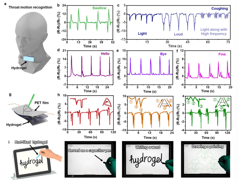 圖6.PAM-Q-M水凝膠的高級(jí)傳感應(yīng)用。(a) 喉部運(yùn)動(dòng)和語(yǔ)音感知的示意圖。對(duì)不同發(fā)音過(guò)程的實(shí)時(shí)電阻變化響應(yīng):(b) 吞咽和(c) 咳嗽以及不同狀態(tài),以及(d-f) 用不同含義說(shuō)英語(yǔ)的語(yǔ)音變化。(g) 簽名感知的示意圖。(h) 不同志愿者書(shū)寫(xiě)“A”的實(shí)時(shí)電阻變化響應(yīng)。(i) 簽名感知的示意圖。在平板電腦上用PAM-Q-M水凝膠電容筆書(shū)寫(xiě)單詞“hydrogel”和繪制銀杏葉圖案。