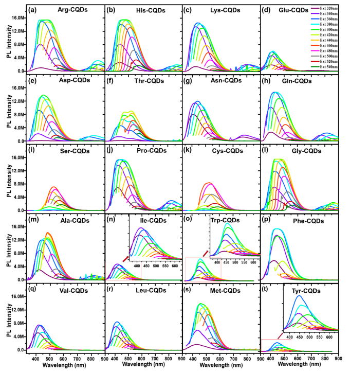 (a) Arg-CQDs(精氨酸修飾碳量子點),(b) His-CQDs(組氨酸修飾碳量子點),(c) Lys-CQDs(賴氨酸修飾碳量子點),(d) Glu-CQDs(谷氨酸修飾碳量子點),(e) Asp-CQDs(天冬氨酸修飾碳量子點),(f) Thr-CQDs(蘇氨酸修飾碳量子點),(g) Asn-CQDs(天冬酰胺修飾碳量子點),(h) Gln-CQDs(谷氨酰胺修飾碳量子點),(i) Ser-CQDs(絲氨酸修飾碳量子點),(j) Pro-CQDs(脯氨酸修飾碳量子點),(k) Cys-CQDs(半胱氨酸修飾碳量子點),(l) Gly-CQDs(甘氨酸修飾碳量子點),(m) Ala-CQDs(丙氨酸修飾碳量子點),(n) Ile-CQDs(異亮氨酸修飾碳量子點;插圖為Ile-CQDs熒光光譜的放大區(qū)域),(o) Trp-CQDs(色氨酸修飾碳量子點;插圖為Trp-CQDs熒光光譜的放大區(qū)域),(p) Phe-CQDs(苯丙氨酸修飾碳量子點),(q) Val-CQDs(纈氨酸修飾碳量子點),(r) Leu-CQDs(亮氨酸修飾碳量子點),(s) Met-CQDs(甲硫氨酸修飾碳量子點),(t) Tyr-CQDs(酪氨酸修飾碳量子點;插圖為Tyr-CQDs熒光光譜的放大區(qū)域)。