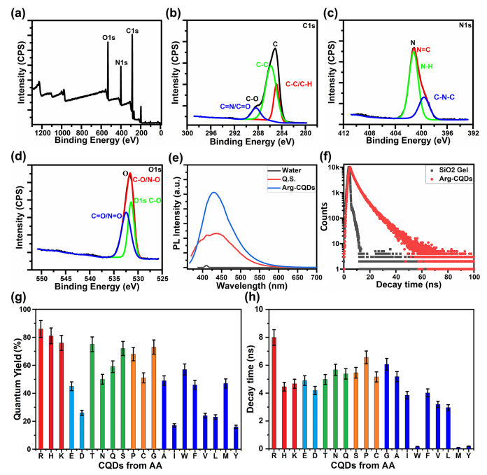(f) Arg-CQDs的PL衰減時間(對數(shù)坐標)。