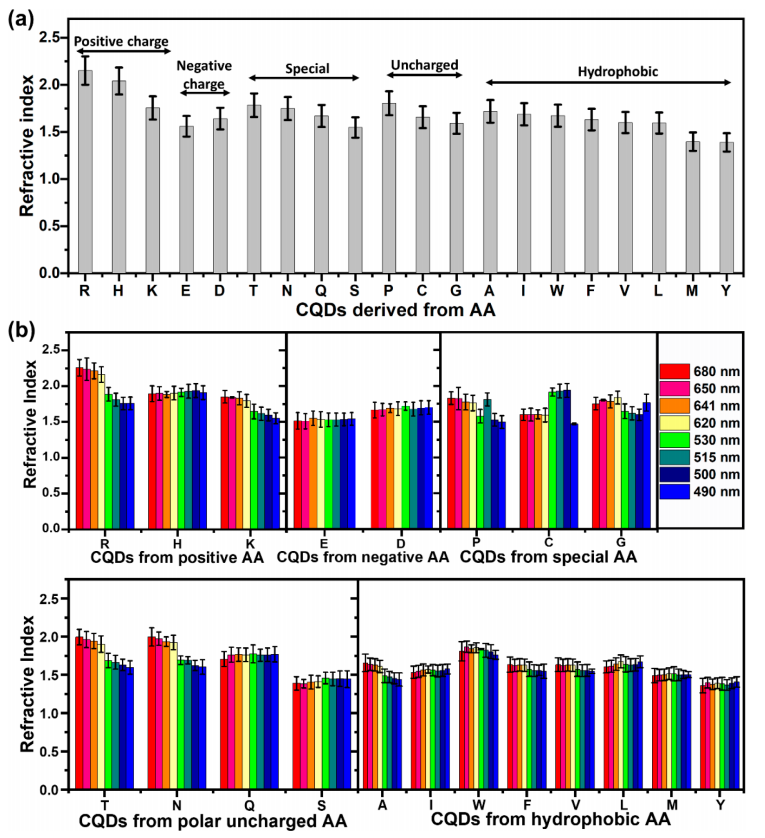 (b) 通過IPM技術測得的AA-CQDs在不同波長(680、650、641、620、530、515、500和490 nm)下的折射率。