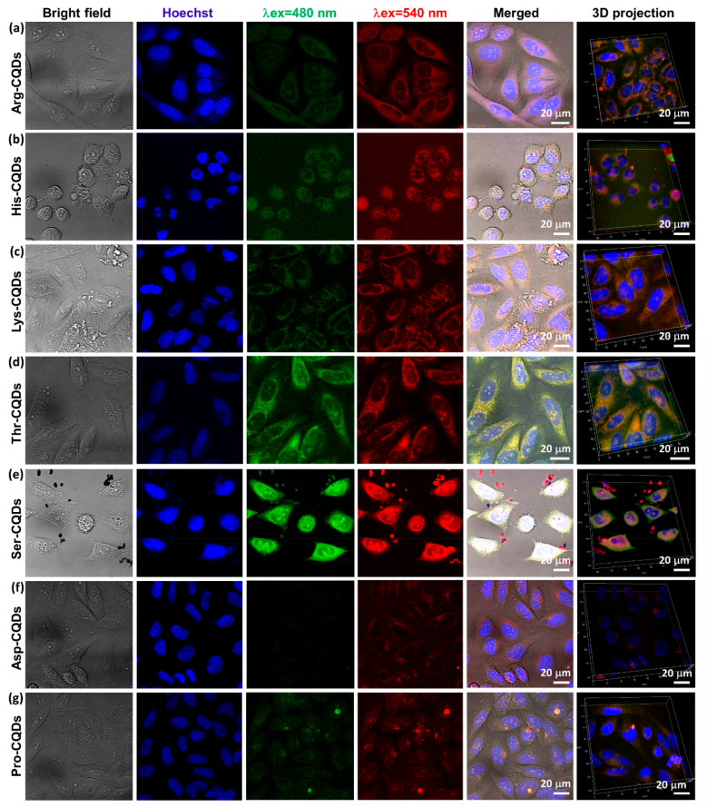 (a) Arg-CQDs(精氨酸修飾)、(b) His-CQDs(組氨酸修飾)、(c) Lys-CQDs(賴氨酸修飾)、(d) Thr-CQDs(蘇氨酸修飾)、(e) Ser-CQDs(絲氨酸修飾)、(f) Asp-CQDs(天冬氨酸修飾)、(g) Pro-CQDs(脯氨酸修飾)的熒光成像結果。