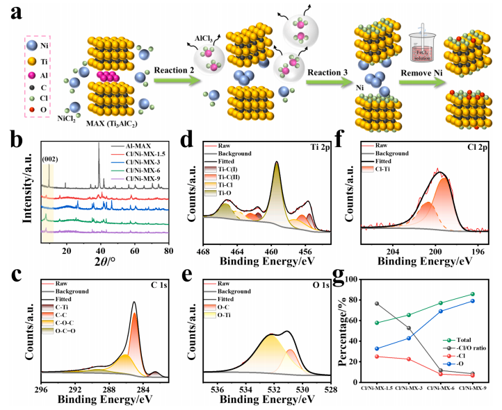 圖1. (a) Ti3C2Cl2制備的機(jī)制圖。(b) Al-MAX和Cl/Ni-MX-x(x=1.5、3、6和9)的XRD圖譜。(c) Cl/Ni-MX-6的C 1s,(d) Ti 2p,(e) O 1s和(f) Cl 2p區(qū)域的XPS精細(xì)譜。(g) Cl/Ni-MX-x表面檢測(cè)到的Cl和O原子含量的比值。
