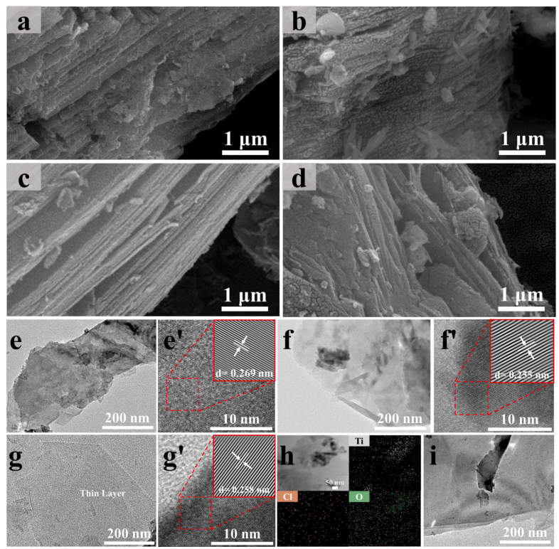 圖2.掃描電子顯微鏡(SEM)圖像:(a) Cl/Ni-MX-1.5,(b) Cl/Ni-MX-3,(c) Cl/Ni-MX-6 和 Cl/Ni-MX-9。透射電子顯微鏡(TEM)和高分辨透射電子顯微鏡(HRTEM)圖像:(e, e') Cl/Ni-MX-1.5,(f, f') Cl/Ni-MX-3,(g, g') Cl/Ni-MX-6 和 (i) Cl/Ni-MX-9,插圖 e'~g' 顯示了 Cl/Ni-MX-x 的逆快速傅里葉變換(IFFT)圖像,(h) Cl/Ni-MX-6 的元素分布圖,顯示了 Ti、Cl 和 O 元素的分布。