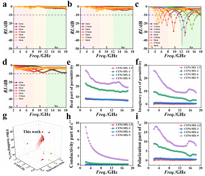 圖3。 (a) Cl/Ni-MX-1.5, (b) Cl/Ni-MX-3, (c) Cl/Ni-MX-6 和 (d) Cl/Ni-MX-9 的二維RL曲線。(e) ε' 的實(shí)部和 (f) 虛部與頻率的關(guān)系圖。(g) MXene吸波性能的比較。(h) 電導(dǎo)率部分和 (i) 極化部分與頻率的關(guān)系圖。