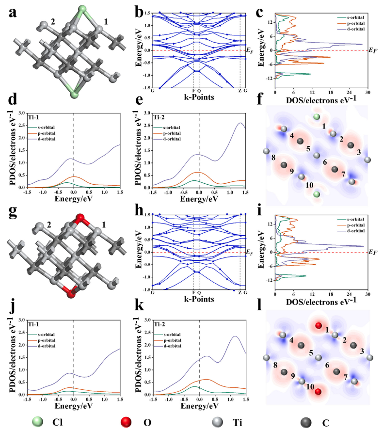 圖5.(a) 模型,(b) 能帶結(jié)構(gòu),(c) DOS分布和(f) Cl端基MXene的電荷密度圖。PDOS圖(d) 連接到Cl端的Ti (Ti-1)和(e) 未連接到Cl端的Ti (Ti-2)。(g) 模型,(h) 能帶結(jié)構(gòu),(i) DOS分布和(l) O端基MXene的電荷密度圖。PDOS圖(j) Ti-1和(k) Ti-2的O端基MXene。