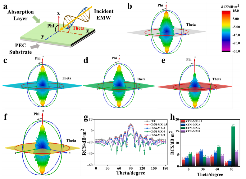 圖7. (a) CST遠(yuǎn)場(chǎng)仿真模型,(b)PEC基底的3D RCS分布圖,(c) Cl/Ni-MX-1.5,(d) Cl/Ni-MX-3,(e) Cl/Ni-MX-6和(f) Cl/Ni-MX-9涂層。 (g) 不同Theta下的RCS曲線2D圖。(h) Cl/Ni-MX-x在特定角度(Theta = 0, 30, 60和90°)相對(duì)于PEC基底的RCS降低值圖。