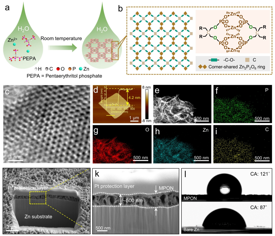 圖1. MPON層的構建與表征。(a) MPON制備過程的示意圖。(b) MPON有序結構示意圖(左)及共頂點的Zn?P?O?環化學結構(右)。(c) MPON結構的高分辨TEM數據。(d) 由MPON層構成的納米片結構AFM圖像及對應高度剖面圖(插圖)。(e) 高分辨TEM圖像,(f-i) EDS元素分布圖,(j,k) 鋅金屬表面MPON層的FIB-SEM橫截面圖像。(l) 2 M ZnSO?電解液在MPON修飾鋅金屬與裸鋅金屬表面的接觸角(CA)測試。