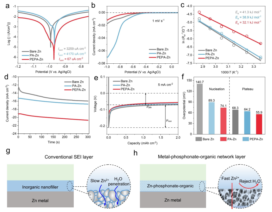 (f)‌:展示了PEPA-Zn、PA-Zn和裸Zn電極的線性掃描伏安法。這用于比較不同電極的電化學性能。