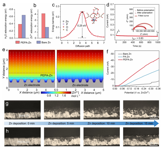 圖4. 不同界面層對Zn/電解質界面化學的影響。 (a) H2O分子和(b) Zn離子在裸Zn和PEPA-Zn表面的吸附能。(c) DFT計算的Zn2+擴散路徑(插圖)和在PEPA-Zn中的相應擴散能壘。(d) PEPA-Zn在20 mV極化前后的電流-時間曲線和相應的EIS(插圖),用于tzn2+測量。(e) COMSOL模擬的PEPA-Zn(左)和裸Zn(右)電極的Zn2+通量。兩條線之間的區域表示MPON。(f) PEPA-Zn、PA-Zn和裸Zn電極的線性掃描伏安法。(g) 裸Zn和(h) PEPA-Zn電極在10 mAcm-2下的原位操作光學顯微鏡可視化Zn電鍍。