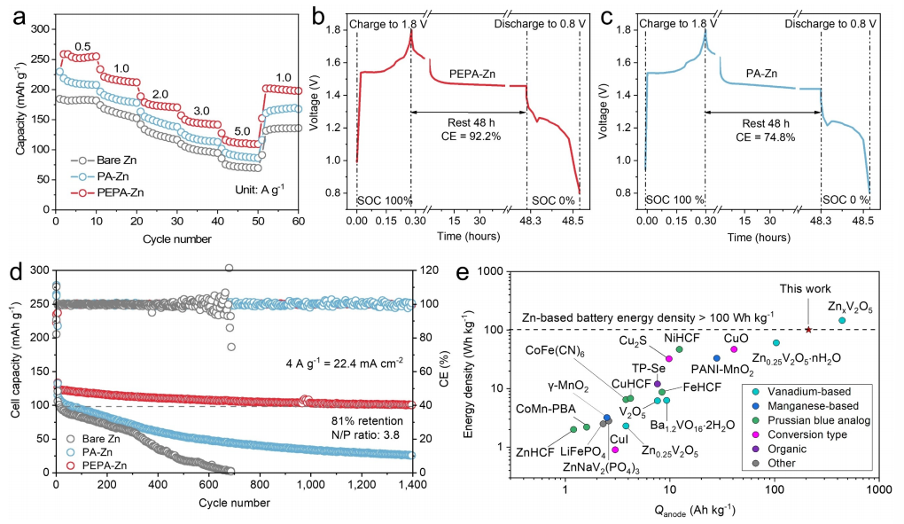 圖(a)展示了PEPA-Zn、PA-Zn和裸Zn電極的線性極化曲線。這些曲線是在相同的條件和有效的表面積下,使用三電極系統以1 mV/s的掃描速率收集的。三電極體系使用Zn箔作為工作電極,Ti箔作為對電極,Ag/AgCl電極作為參比電極。