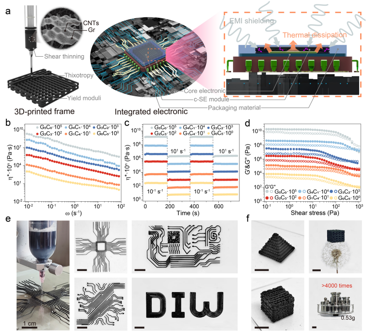 電磁干擾屏蔽(EMI SE)模塊是現(xiàn)代電子設(shè)備的核心組件。然而,傳統(tǒng)的金屬基屏蔽模塊在電子設(shè)備內(nèi)部占據(jù)不可或缺的三維空間,成為電子設(shè)備集成化的主要障礙。本文將3D打印共形屏蔽(c-SE)模塊與包裝材料集成到核心電子器件上,為在不占用額外空間的情況下實現(xiàn)理想的屏蔽功能提供了無限可能。本文精心配制了含有石墨烯和碳納米管納米粒子的3D打印功能性墨水,通過操控其流變性能,制造出了具有超輕結(jié)構(gòu)(0.076 g/cm³)和高效電磁干擾屏蔽性能(61.4 dB)的3D打印框架。特別地,3D打印的c-SE模塊與電子器件原位集成,成功替代了傳統(tǒng)金屬基模塊,為電磁兼容和熱耗散提供了多重功能。因此,這項科學(xué)創(chuàng)新完全彌補了碳基c-SE模塊組裝的空白,并為開發(fā)具有任意定制結(jié)構(gòu)的下一代高性能屏蔽材料照亮了道路。