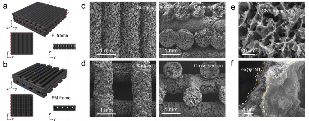 :通過調(diào)控石墨烯(Gr)和碳納米管(CNT)在纖維素基質(zhì)中的比例,設(shè)計出具有優(yōu)異流變性能的3D可打印墨水,支持復(fù)雜結(jié)構(gòu)的直接墨水書寫(DIW)成型,突破了碳基材料難以精密加工的瓶頸。