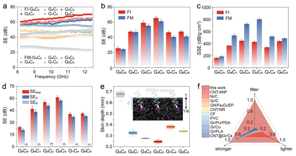 d,e) FM框架的電磁參數(shù)(總屏蔽效能SE<sub>total</sub>、吸收損耗SE<sub>A</sub>、反射損耗SE<sub>R</sub>)與趨膚深度(δ)
