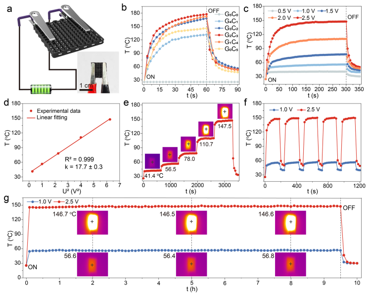 c,d) FM-G2C3框架在0.5-2.5V多級輸入電壓下的焦耳熱響應(yīng)曲線,及平衡溫度隨輸入電壓平方(U²)變化的線性擬合