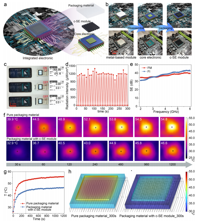 f,g) 純封裝材料與集成c-SE模塊封裝材料的紅外熱成像圖(反映電子器件散熱輔助效果)及實時溫度曲線