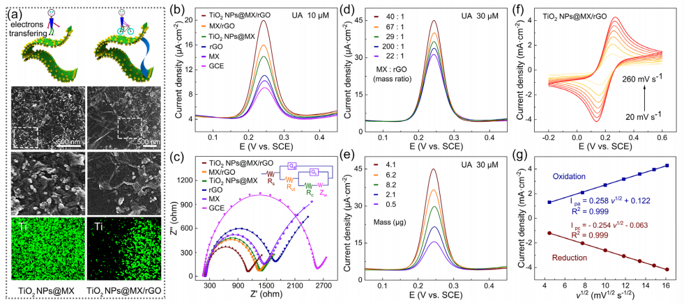 | TiO? NPs@MX/rGO | DPV電流密度較MX/rGO電極↑25% (圖2b) | rGO增強界面電荷轉移能力7 |