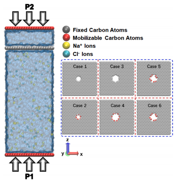 ‌總結(jié)‌:圖1通過初始模型示意圖和六種不同納米孔的展示,為研究水分子在納米孔中的傳輸行為提供了一個清晰的框架和具體的研究對象,有助于進一步探索納米尺度下的水分子傳輸機制。