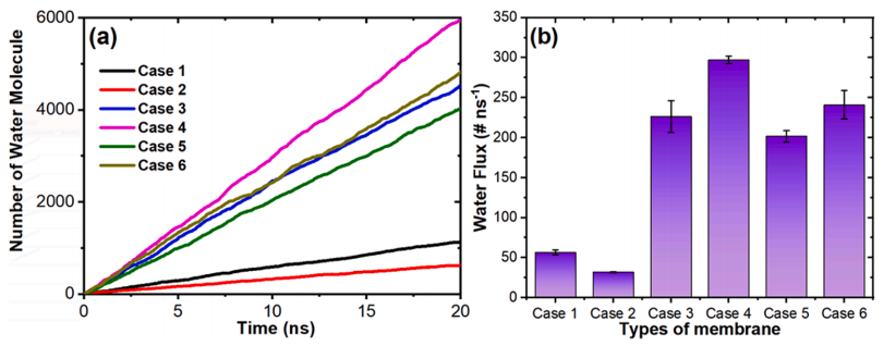 圖 2. (a) Case 1–Case 6 中水分子滲透率隨時間的變化;(b) 六種 GO 膜的水通量。‌