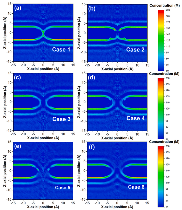 綜上所述,圖4通過對比不同功能化和孔徑大小的GO納米孔中水分子的二維濃度分布,揭示了親水性基團和孔徑大小對水分子傳輸行為的影響。親水性基團通過增強與水分子的相互作用,提高了孔內(nèi)水分子的濃度,從而有助于提升水通量;而孔徑大小則決定了水分子在孔內(nèi)的傳輸方式和效率。