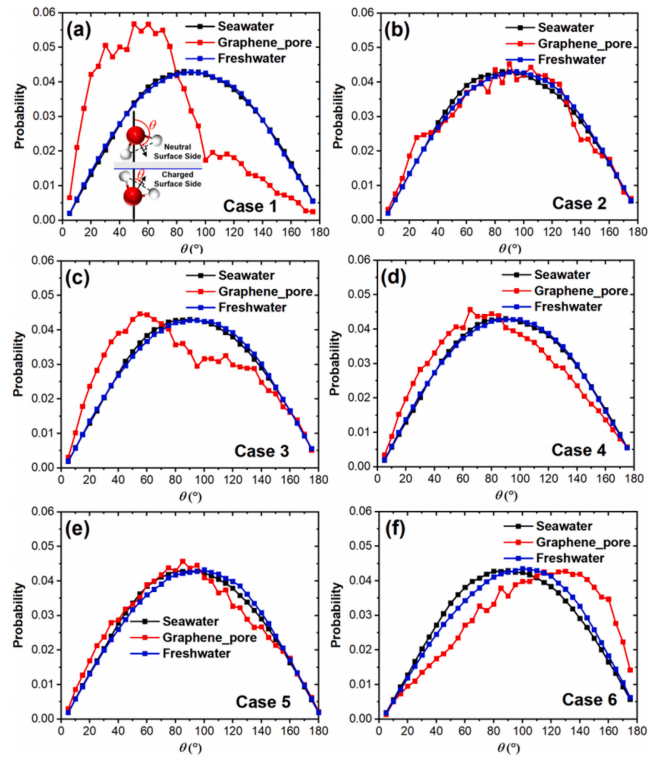 ‌淡水側(cè)(藍(lán)線)‌ 雙峰(如 GO-OH在 θ=20°/160°) 界面水分子反向重構(gòu)
