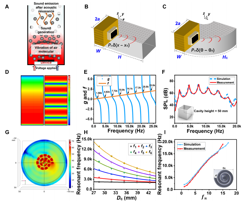 圖1D:基于熱聲共振的腔體中聲音放大的機制,以及不同條件下聲音設備的聲音性能