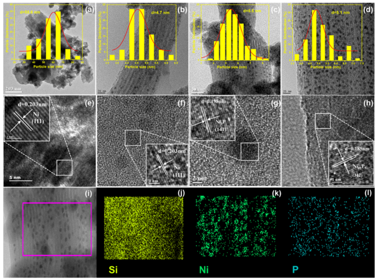 ‌圖2. Ni/SBA-15 (a, e)、0.2PNi/SBA-15 (b, f)、0.3PNi/SBA-15 (c, g) 和 0.6PNi/SBA-15 (d, h) 的TEM及HRTEM圖像;0.3PNi/SBA-15的HAADF-STEM圖像 (i) 以及Si、Ni、P元素的EDS面掃圖譜 (i−l)‌