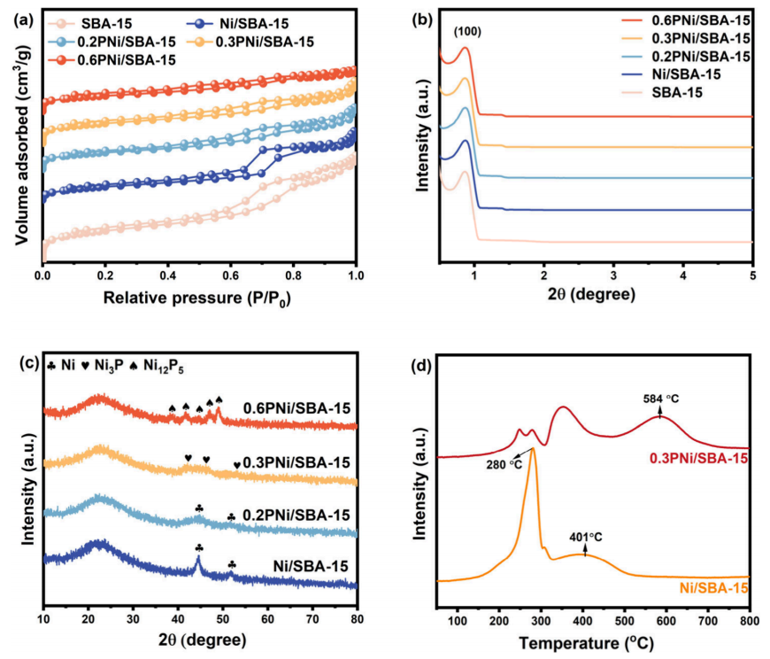 綜上所述,Figure 1清晰地展示了xPNi/SBA-15催化劑的合成過程,包括植酸的引入、金屬離子的吸附以及熱還原與磷化等關鍵步驟。這一過程巧妙地利用了植酸的多種功能,實現了鎳磷化物納米顆粒在SBA-15介孔通道內的均勻分散和高效錨定,為制備高性能催化劑提供了新思路。
