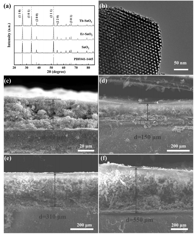 圖 3. (a) 裸SnO?納米纖維及稀土摻雜(RE-doped)SnO?納米纖維的XRD圖譜;(b) SBA-15顆粒的TEM圖像;(c-f) 測試瓷管上RE-SnO?涂層與RE-SnO?/SBA-15涂層的截面SEM圖像對比。