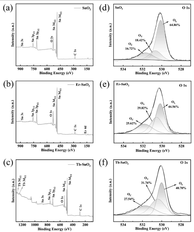 圖4. (a-c) 裸SnO?納米纖維與稀土摻雜(RE-doped)SnO?納米纖維的XPS全譜;(d-f) 相應的O 1s高分辨率XPS譜圖。