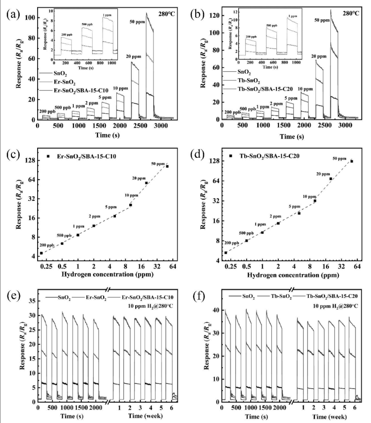 圖6. (a-b) 基于裸SnO?、RE-SnO?和RE-SnO?/SBA-15的傳感器對不同氫氣濃度的動態響應曲線;(c-d) RE-SnO?/SBA-15對氫氣濃度的線性關系;(e-f) 裸SnO?、RE-SnO?和RE-SnO?/SBA-15的重復響應/恢復曲線。(a)和(b)中的插圖分別展示了對應傳感器在2 ppm以下氫氣濃度的動態響應曲線細節。所有數據均在280℃、環境濕度25%RH條件下獲得。