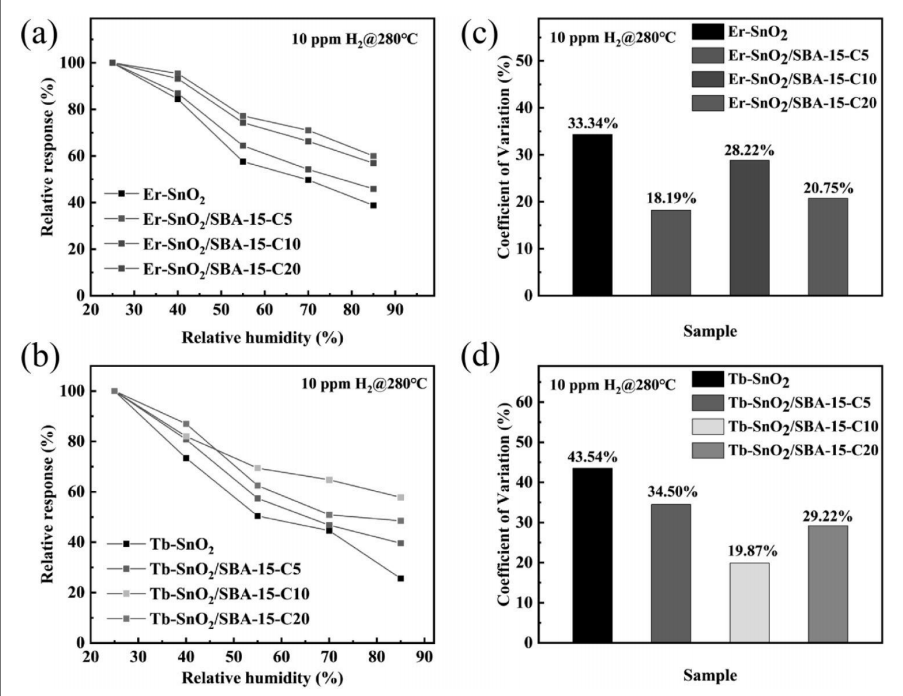 圖7. (a-b) 基于RE-SnO?和RE-SnO?/SBA-15的傳感器在不同環境濕度(25%RH至85%RH)下對10 ppm氫氣的相對響應變化;(c-d) 對應傳感器的變異系數。(相對濕度在25℃室溫環境下設定,傳感器測試溫度為280℃最佳工作溫度。)