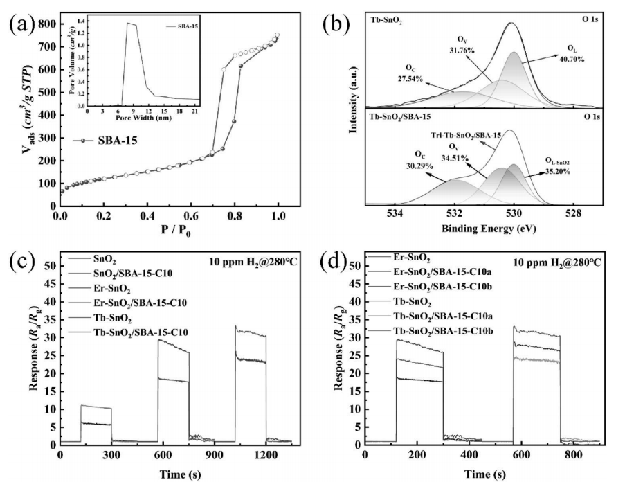 SBA-15的分子篩效應選擇性富集H?,結合Tb-SnO?的高活性表面,使靈敏度達裸SnO?的4.5倍。