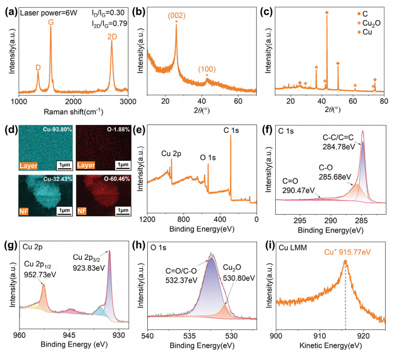 1、‌物相組成‌:NFs-LIG復(fù)合材料以Cu?O納米花為主導(dǎo),金屬銅為次要相,LIG為導(dǎo)電基底;2、‌界面特性‌:XPS證實Cu?O與LIG間存在電荷轉(zhuǎn)移,C 1s峰位移表明界面鍵合;