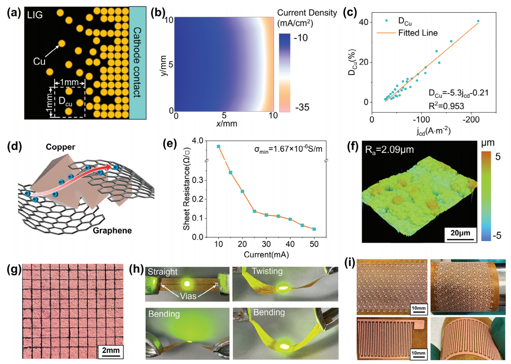 h) 通過通孔互連的雙層柔性電路;i) Cu-LIG復(fù)合材料制成的蛇形線路與叉指電極;