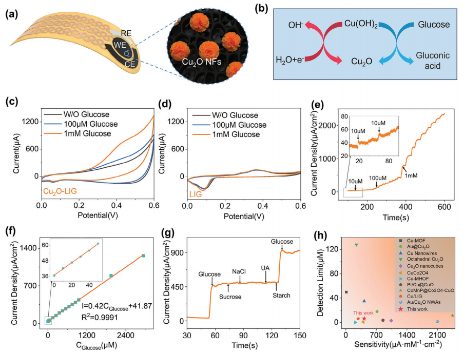 圖 5. Cu-LIG 葡萄糖電化學(xué)傳感器特性。‌ a) 電化學(xué)傳感器結(jié)構(gòu)示意圖。 b) 電化學(xué)傳感機制示意圖。 c) Cu-LIG 傳感器和裸 LIG 在 0.1 M NaOH (pH 12.7) 中,含 100 μM / 1 mM 葡萄糖和不含葡萄糖時的 CV(循環(huán)伏安)曲線。 d) 在 0.1 M NaOH (pH 12.7) 中,含 100 μM / 1 mM 葡萄糖和不含葡萄糖時(應(yīng)為裸 LIG)的 CV 曲線(注:原文此處d的描述似乎缺失主語,根據(jù)c推斷是指裸LIG)。 e) 在攪拌的 0.1 M NaOH (pH 12.7) 中,施加 0.4 V 電壓時,傳感器對連續(xù)注入葡萄糖的電流響應(yīng)。 f) 電流相對于葡萄糖濃度的相應(yīng)校準(zhǔn)曲線 (R² = 0.99)。 g) Cu-LIG 傳感器在 0.1 M NaOH 中含有 50 μM 葡萄糖和 50 μM 其他干擾物質(zhì)(包括蔗糖、NaCl、尿酸 (UA) 和淀粉)時的干擾測試。 h) 用于葡萄糖傳感的 Cu-LIG 傳感器與其他傳感電極的性能比較。