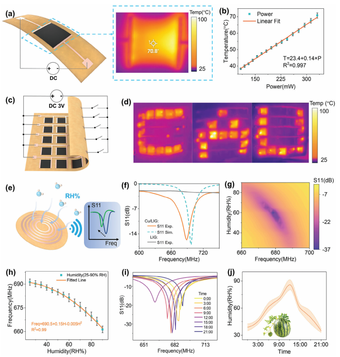 圖 6. Cu-LIG 復(fù)合膜的應(yīng)用。‌ a) Cu-LIG 薄膜加熱器示意圖。插圖為用于測量 LIG 表面溫度的紅外成像圖。 b) LIG 加熱器在不同電功率 (P) 下的溫度變化。 c) 熱成像貼片示意圖。該貼片由 5×5 陣列的加熱單元組成,每個單元由 LIG 制成,并通過銅電路和通孔互連。 d) 熱成像貼片的紅外圖像。通過調(diào)節(jié)不同加熱單元的開/關(guān)狀態(tài),在貼片表面顯示出字母 “CAU”。 e) 無線濕度傳感器示意圖。濕度傳感通過測量 PI 紙(聚酰亞胺紙)吸收水分子導(dǎo)致介電常數(shù)變化,從而引起的諧振頻率 (Freq) 偏移來實現(xiàn)。 f) 在 25% 環(huán)境濕度下的仿真結(jié)果和 S11 參數(shù)測量結(jié)果。 g) 無線傳感器在 25% 到 90% 相對濕度 (RH) 下的響應(yīng)。 h) 傳感器在 25% 到 90% RH 不同濕度水平下的諧振頻率變化。 i) 附著在西瓜葉片下表面的無線傳感器在 24 小時內(nèi)的響應(yīng)。 j) 在 24 小時內(nèi)測得的西瓜葉片下表面濕度變化。