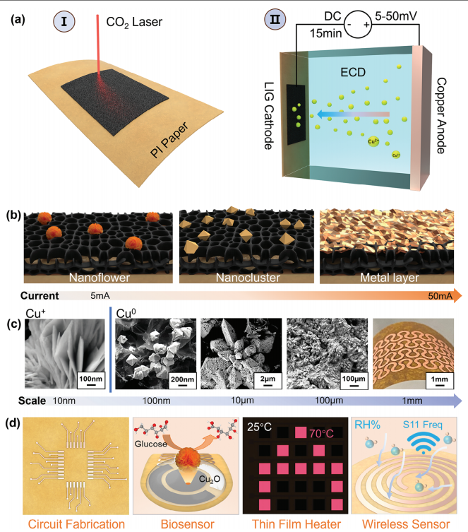 柔性電子器件是各種系統(tǒng)中的重要組件,如顯示器、微處理器、傳感器和可穿戴健康監(jiān)測器。這些設(shè)備的特點是能夠彎曲、拉伸、貼合并保持便攜性。在柔性器件中融入微/納米結(jié)構(gòu)可以顯著提高其性能。然而,不同結(jié)構(gòu)之間的尺寸不匹配使得柔性電子器件的制造過程復(fù)雜化。最近,聚酰亞胺(PI)上的激光誘導(dǎo)石墨烯(LIG)作為一種大規(guī)模生產(chǎn)微/納米結(jié)構(gòu)的有前途的方法而嶄露頭角。本研究提出了一種利用LIG作為種子層在其表面進行銅的電化學(xué)沉積(ECD)的工藝流程,以實現(xiàn)由Cu-LIG異質(zhì)材料組成的高效、無掩模制造的柔性電路。