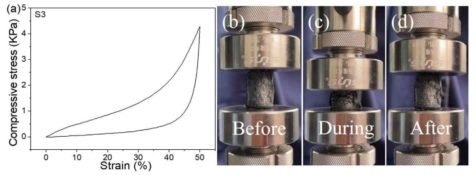 圖 10 通過 ‌應力-應變曲線 (a)‌ 和 ‌壓縮過程數碼照片序列 (b-d)‌,系統地展示了 ‌NRGO/Co?O? 復合氣凝膠最優樣品 S3‌ 的 ‌壓縮力學行為和彈性回復特性‌。
