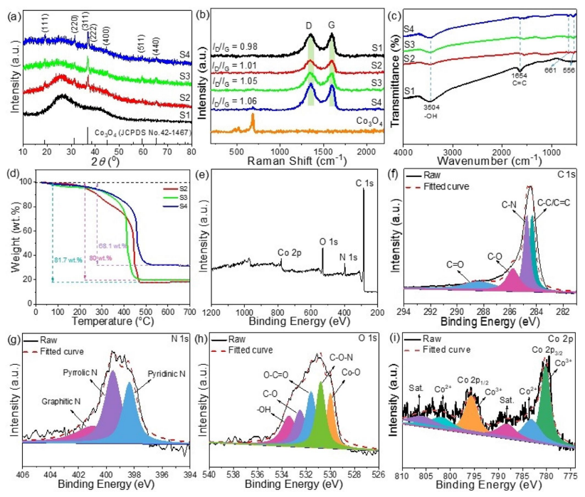 圖 2. 樣品S1-S4的XRD圖譜 (a),Co?O? 和 S1-S4 的拉曼光譜 (b),S1-S4 的 FTIR 光譜 (c),S2-S4 的 TGA 曲線 (d);S3 的 XPS 譜圖:全譜掃描 (e),C 1s 譜 (f),N 1s 譜 (g),O 1s 譜 (h),Co 2p 譜 (i)。
