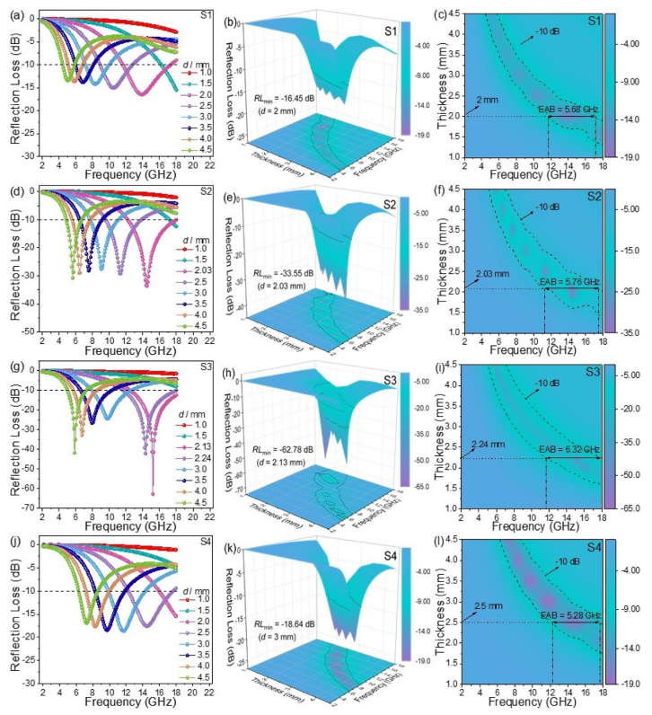 圖 5. 反射損耗的頻率依賴性曲線、反射損耗的 3D 圖譜和 2D 等高線圖:(a-c) S1, (d-f) S2, (g-i) S3, (j-l) S4。