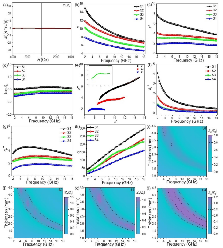 圖 6. Co?O?的磁滯回線 (a);S1-S4的介電常數實部ε' (b)、虛部ε" (c)和介電損耗角正切tanδ (d)的頻率依賴性;S1-S4的Cole-Cole曲線 (e);S1-S4的磁導率實部μ' (f)、虛部μ" (g)和衰減常數α (h)的頻率依賴性;S1 (i), S2 (j), S3 (k), S4 (l)的阻抗匹配(|Zin/Z0|)等高線圖。