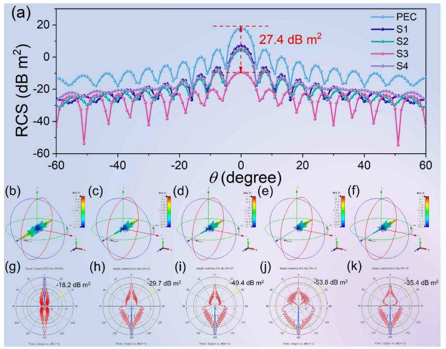 · 圖 8. (a) 典型的雷達散射截面(RCS)模擬曲線;CST遠場仿真結果:(b) 理想電導體(PEC)平板, (c) S1覆蓋的PEC平板, (d) S2覆蓋的PEC平板, (e) S3覆蓋的PEC平板, (f) S4覆蓋的PEC平板;-180°到180°范圍內的雷達散射截面(RCS)值:(g) PEC平板, (h) S1覆蓋的PEC平板, (i) S2覆蓋的PEC平板, (j) S3覆蓋的PEC平板, (k) S4覆蓋的PEC平板。