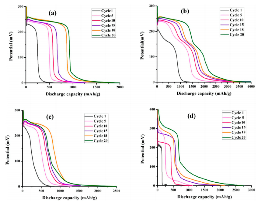 圖6. (a)AC、(b)AC/SnO?、(c)AC/CuO、(d)AC/Fe?O?樣品在對稱電流密度±1 A/g下的放電容量曲線。