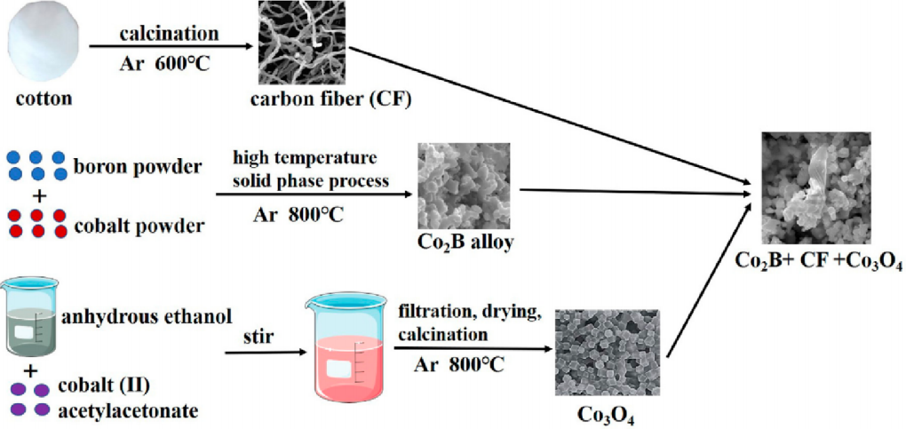圖7. 硼化鈷(Co?B)、碳纖維(CF)及四氧化三鈷(Co?O?)的合成流程示意圖。