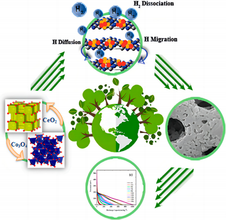 圖8. 基于Co?O?−CeO?/g-C?N?納米復合材料的三元電催化劑在儲氫應用中的設計策略與溢出機理示意圖。