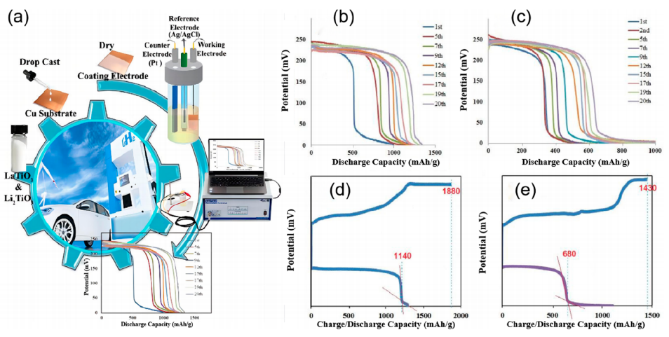 圖9. (a) 整體制備路線、工作電極及電化學測試裝置示意圖;(b) LaTiO?連續20次儲氫性能曲線序列;(c) Li?TiO?連續20次儲氫性能曲線序列;(d) LaTiO?最大充放電循環曲線;(e) Li?TiO?納米顆粒最大充放電循環曲線。經許可轉載自參考文獻220。版權歸2022年Elsevier所有。