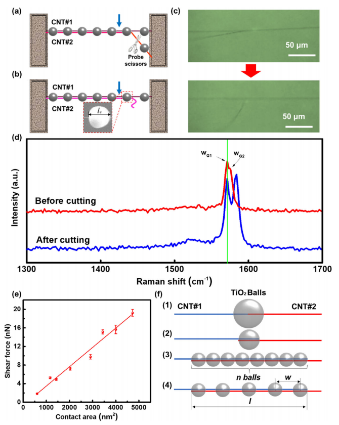 這段圖注描述了研究者如何通過顯微鏡觀察(圖c)、光譜分析(圖d)和力學測試(圖e的核心數據及其原理圖a,b)來表征CNTs與TiO?之間的相互作用(尤其是剪切力)。特別值得注意的是,圖f提出了一種創新的應用策略:利用TiO?小球作為媒介來焊接/連接CNTs。圖e中的剪切力-接觸面積關系圖是定量理解兩者相互作用強度的關鍵數據,誤差棒則提供了數據的可靠性信息。整個圖2系統地闡述了從測量機理到數據分析,再到創新應用設想的研究過程。