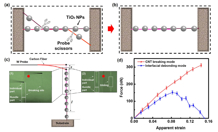 ‌a-c)‌ 測量技術示意圖。(c)圖中的插圖為測量過程的光學圖像。l和δ分別表示重疊(束)長度和力懸臂梁尖端的偏轉位移。‌d)‌ 碳納米管(CNT)斷裂模式和界面脫粘模式的典型力-應變曲線。誤差棒由力測量值的不確定性確定。